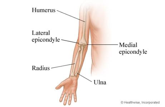 To understand what tennis elbow is, let’s break down its technical name – lateral epicondylopathy. The suffix, -opathy, refers to dysfunction, and in this case, it is dysfunction of the lateral epicondyle. As you can see in the pictures below, the lateral epicondyle is the outermost bone of your elbow and is the point where all the muscles that extend your wrist attach (the 2nd picture is looking at your right elbow from the back side with the palm facing forward, whereas the 1st picture is looking at your right elbow from the front side). With this anatomy in hand, tennis elbow refers to an irritation of the tendons of the wrist extensors as they attach onto the lateral epicondyle.
